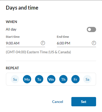 - Click the Clock Icon and select Add Schedule to define your active hours as shown below: