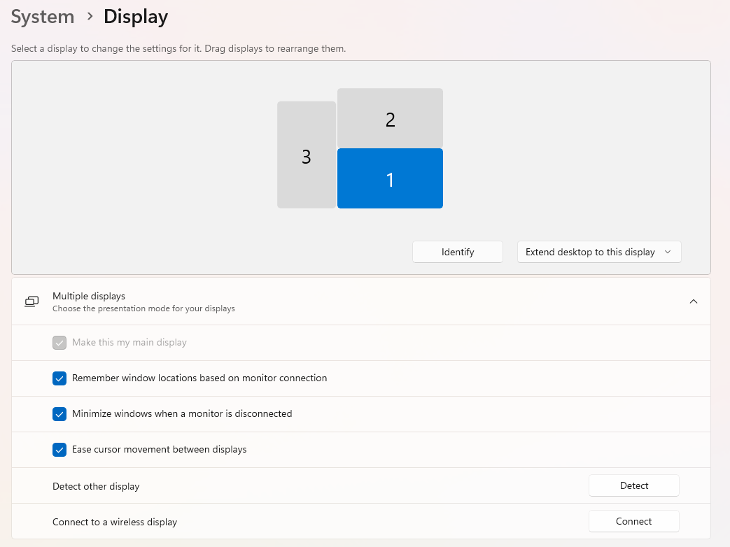 All display-related settings can be found within Windows Settings by navigating to Settings -> System -> Display. Below is an example of a 3 monitor setup: