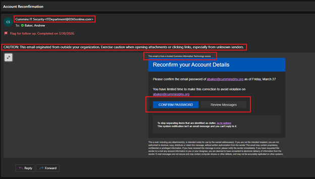 - “This email is from a trusted Cummins Information Technology source”. This is deceiving and is meant to add legitimacy to the message